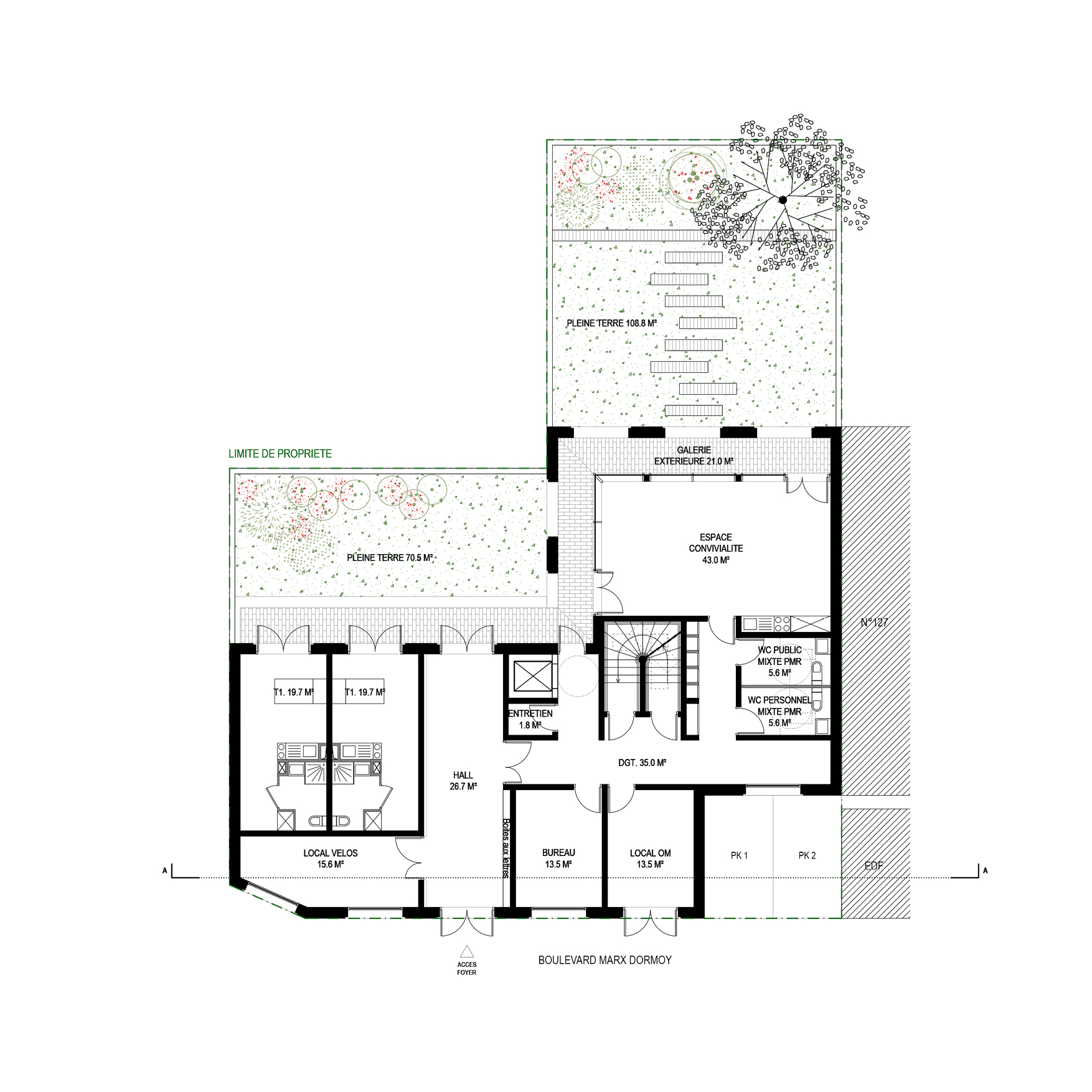 Essentiel résidentiel, le boulevard Marx Dormoy présente des immeubles d’époques et de styles différents, où enduits et briques se côtoient et séquencent la rue. En s’appuyant sur cette minéralité et en proposant un gabarit semblable à ses mitoyens, le bâtiment s’intègre au quartier. Le projet a le souhait de faire pénétrer la lumière et de libérer des vues; d’une part sur le boulevard Marx-Dormoy en adoptant une large trame régulière d’ouvertures de façade et d’autre part en réalisant un bâtiment traversant en RDC et ouvert sur le cœur d’ilot.